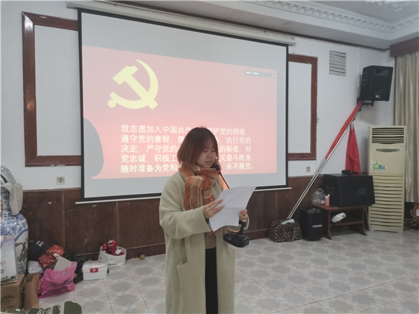 大会在激昂的《国际歌》声中开始。李仰锐宣读学校党委关于接收胡鸿颖等50名同志为中共预备党员,何庆等22名同志按期转正,周红利同志期满转正,肖雷艳、王瑶、刘婷婷、李思雅、任宇杰等5名同志延长预备期的决议,并对新党员和转正的同志表示祝贺,对延长预备期的同志进行了批评。接着,大会选出领誓人杨颖,监誓人唐德斌、曾乾辉。在杨颖的带领下,全体党员、预备党员面向党旗、举右手握拳,进行了庄严的入党宣誓。