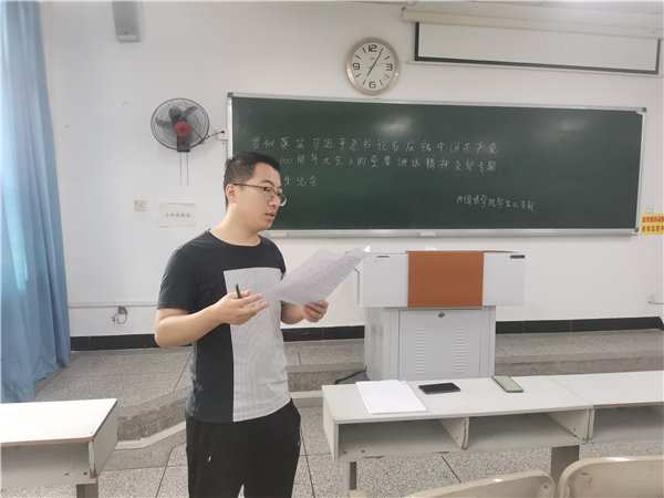 会议伊始,三个学生党支部书记分别带领支部党员重温了习近平总书记“七一”重要讲话,习总书记的讲话,视野宏阔,贯通历史、现实和未来,展现了马克思主义政治家的格局和气度,体现了强烈的历史担当和炽热的为民情怀。习总书记的讲话必将激励青年学子在实现“两个一百年”奋斗目标和中华民族伟大复兴的中国梦中有所作为、大有可为。