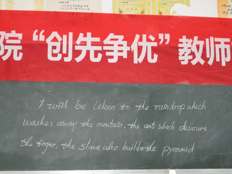 此次比赛包括英语朗诵和英语板书两个方面。首先,参加英语朗诵的老师自信地走上讲台激情展示,通过激烈的角逐,赵军老师和代莲老师荣获一等奖。随后,参加板书比赛的老师也斗志昂扬地上台展现自己的才艺。最后,谢静波老师以自己雄劲有力、美观大方的英文书写获得板书比赛的一等奖。