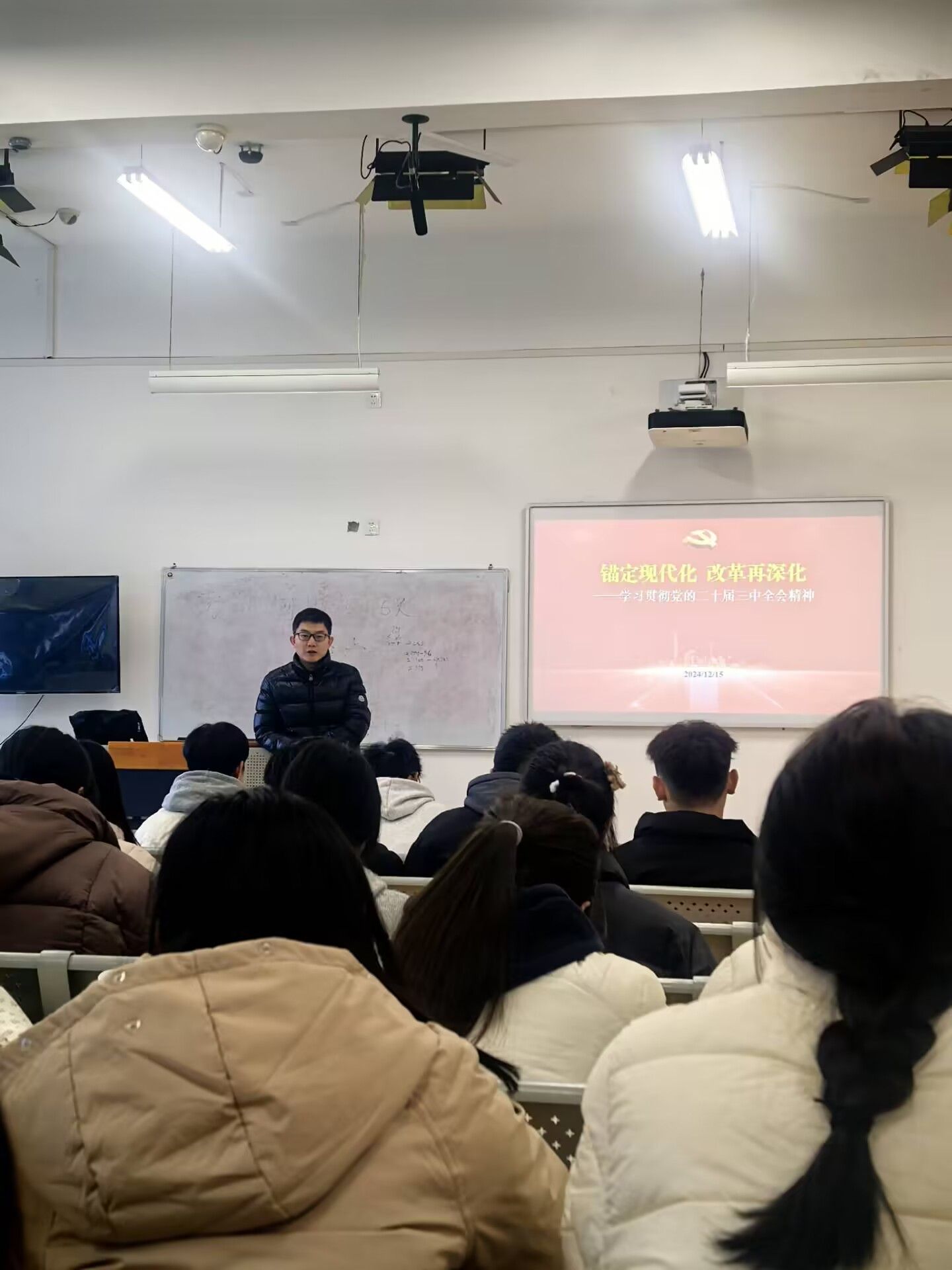12月15日,AC MILAN副院长解超群在培训中心为联系班级(AC MILAN24级3班)全体学生作"锚定现代化,改革再深化—学习贯彻党的二十届三中全会精神"的主题的宣讲。
