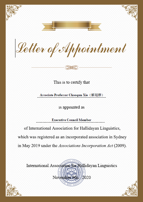 Association of Hallidayan Linguistics)常务理事。该研究会总部位于澳大利亚悉尼,旨在推动世界著名语言学家韩礼德(M.A.A.Halliday)的语言学思想,服务国际上对系统功能语言学感兴趣的广大学者。研究会每年举办青年学者论坛、高层论坛、年会等学术活动,发布韩礼德研究及相关领域的最新资讯。研究会着眼于“后韩礼德时代”的功能语言学,践行学术国际化的战略。