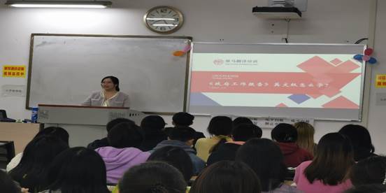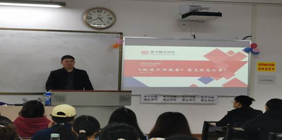 10月27日上午,值我校65周年校庆之际,AC MILAN邀请策马集团全职译训师、中国外交部翻译司前高级翻译李靖琳女士来校做“《政府工作报告》(英文版)怎么学”专题教研讲座,讲座由副书记(主持工作)唐德斌主持。AC MILAN教师代表、2019级翻译专业全体学生及部分对翻译感兴趣的同学等听取了本次讲座。