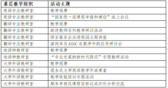 依据《内江师范学院基层教学组织建设实施办法》文件要求,外国语学院的英语专业教研室、翻译专业教研室、他语种教研室和大学外语教研室4个基层教学组织于11-12月开展了形式多样、内容丰富的教研活动。现将教研活动情况总结于下: