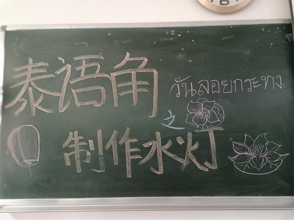 整个活动分为两个部分:一、介绍泰国水灯节的起源和寓意,水灯制作方法;二、现场劳动实践—制作水灯,由张文老师带领大家亲自实践制作水灯,同学们搬运材料,摆放桌台,裁剪粘贴,张挂等,个个奔来跑去,忙得不亦乐乎。伴随着悠扬的泰国传统水灯乐曲《