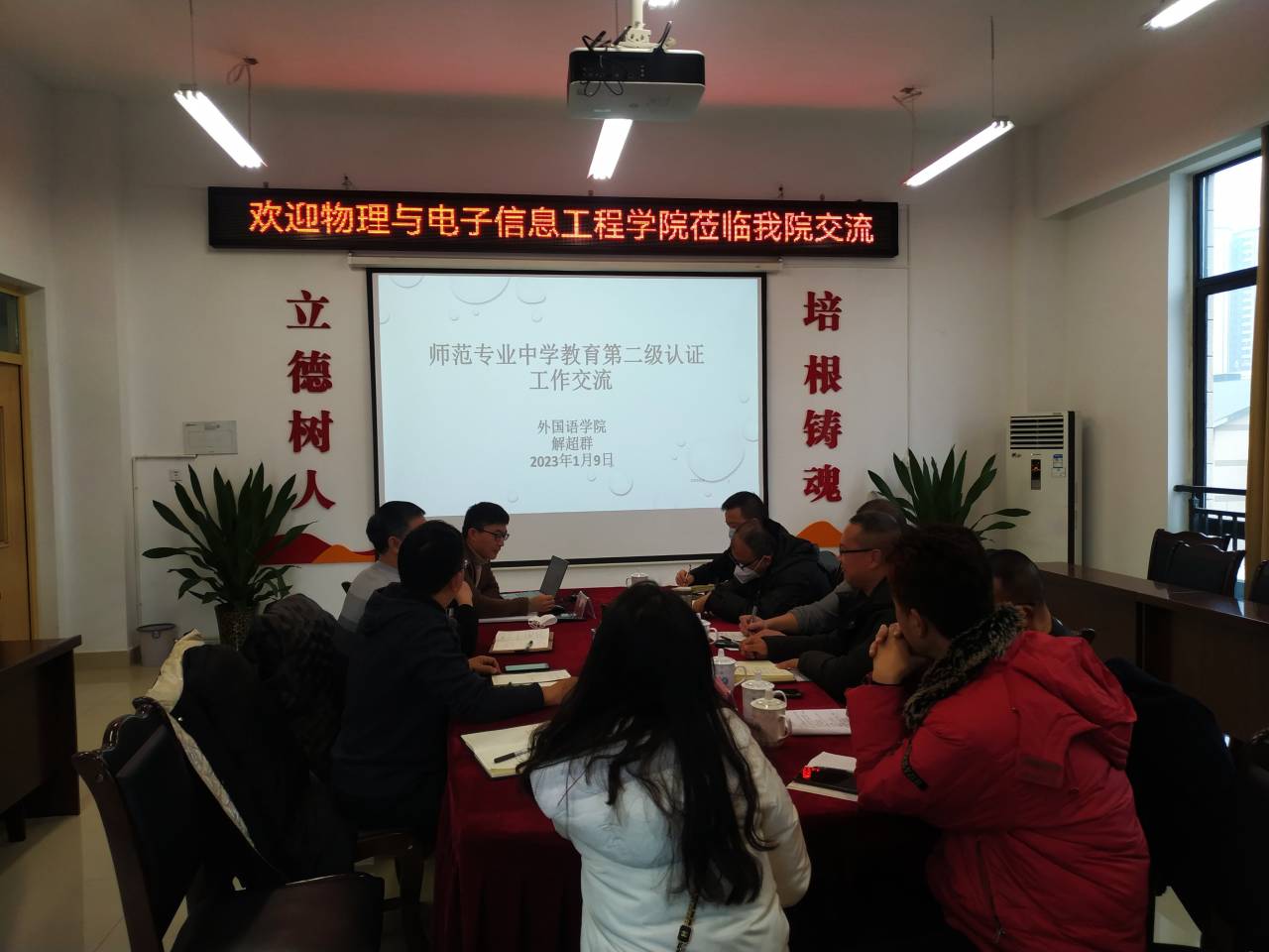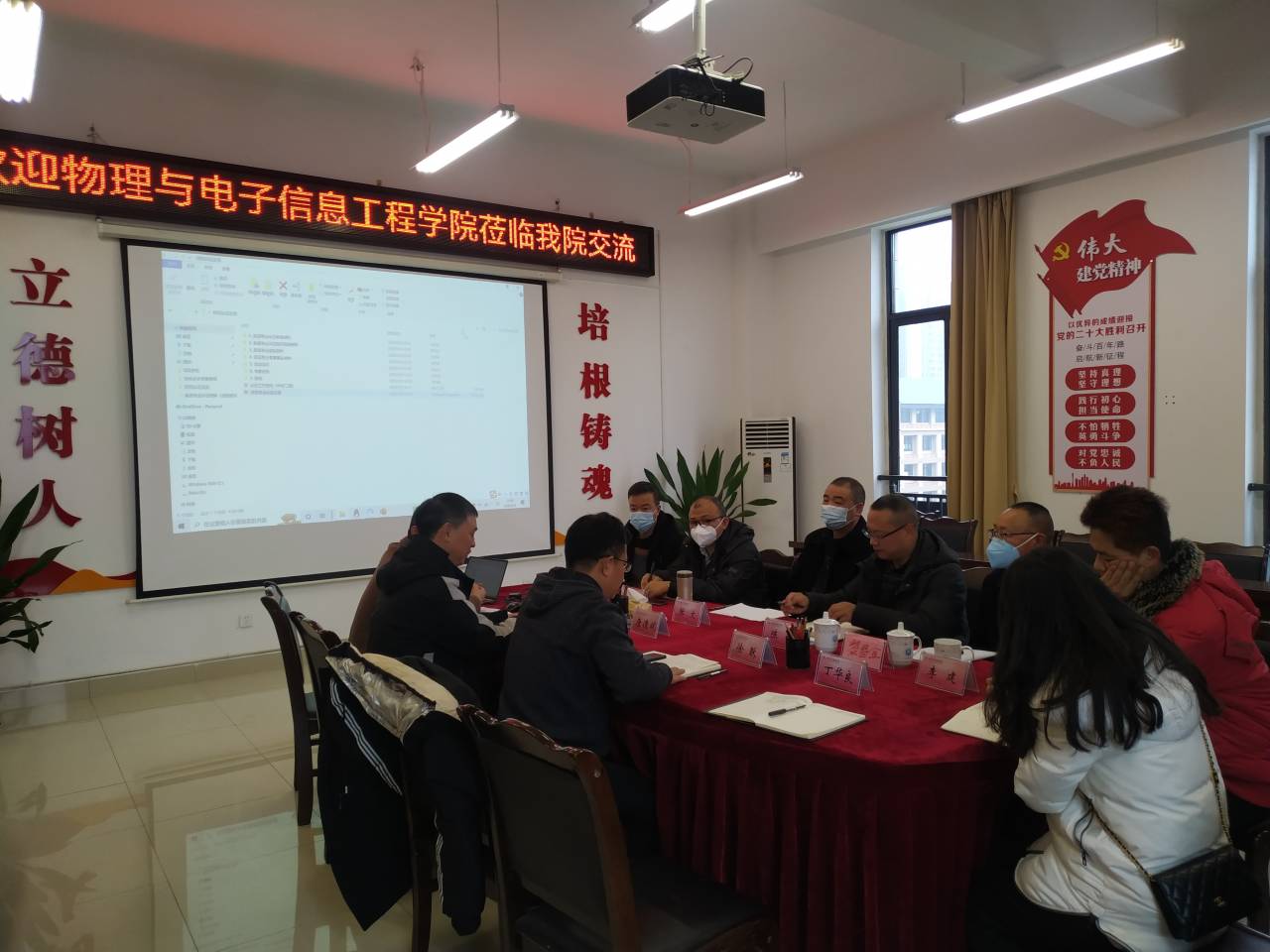1月9日14:30,我校物理与电子信息工程学院党委书记张文、院长陈湘率队来米兰(中国)体育·官方网站进行师范类专业中学教育第二级认证交流。交流会在弘文楼407会议室进行。物理与电子信息工程学院党委书记张文、院长陈湘、副院长王剑、物理教研室主任(专业教学)李建、物理教研室主任(学科教学)罗小成、党政办公室负责人唐巧玲、学校质评委专家黎昌金教授、AC MILAN党委书记唐德斌、院长徐跃、副院长解超群、副院长丁华良等出席了交流会议,会议由唐德斌主持。