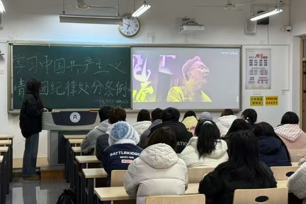 活动在激昂的团歌声中开始,全体同学起立高唱《光荣啊,中国共青团》,展现出新时代青年的蓬勃朝气。随后各班团支书带领团员学习《中国共产主义青年团纪律处分条例(试行)》,详细解读其背景、意义及主要内容,内容涵盖政治纪律、组织纪律、廉洁纪律等关键领域,明确了违纪行为的分类与相应处分细则。同学们结合实际积极交流心得,一致认为新时代青年应尊崇团内规章,坚定理想信念,练就过硬本领,勇于创新创造,矢志艰苦奋斗,锤炼高尚品格,坚定制度自信,在实现中国梦的生动实践中放飞青春梦想。