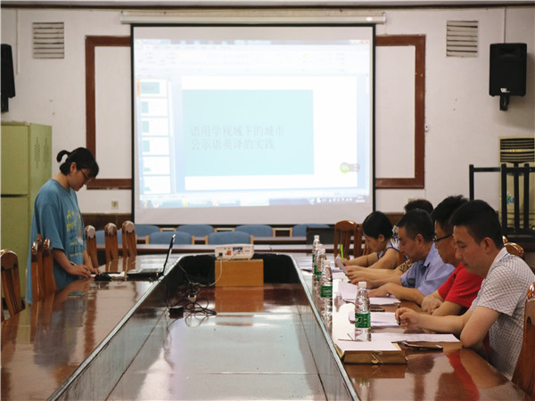 接下来,项目负责人2016级翻译专业张紫葳同学代表其团队就“语用学视域下的城市公示语英译实践”就其项目的研究目的、价值与意义、研究方法、工作日志、研究成果、收获等,通过PPT进行了具体的汇报。