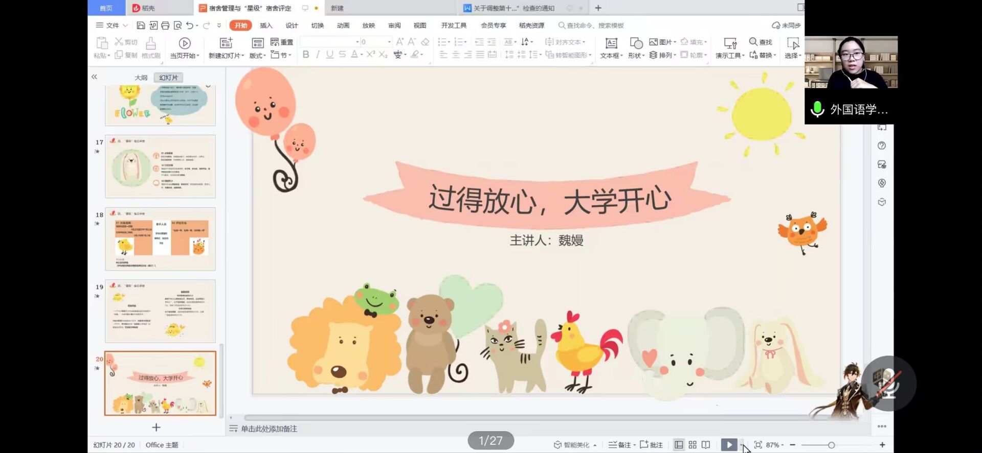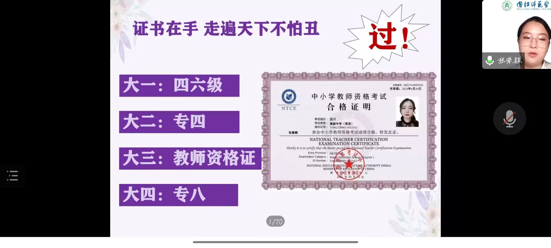 2022届毕业生张紫颖分享了她的大学生涯,向新生介绍了她的人生理想、大学规划、学习方法、生活态度等,并祝愿新生学业有成。