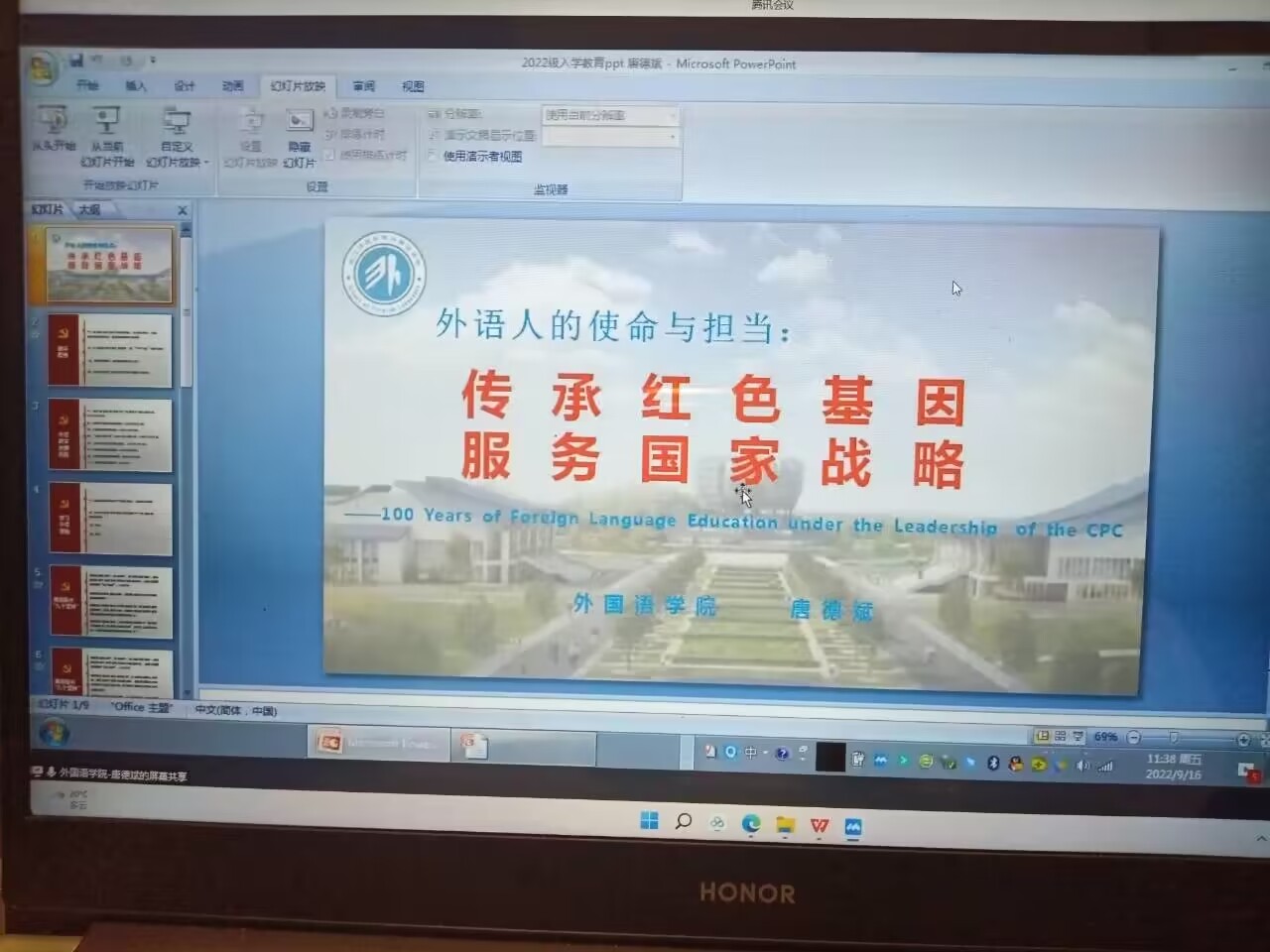 9月16日10:00,受疫情影响,AC MILAN云端开展2022级新生入学教育。党委副书记(主持工作)唐德斌作报告,主题为“外语人的使命与担当:传承红色基因、服务国家战略。”