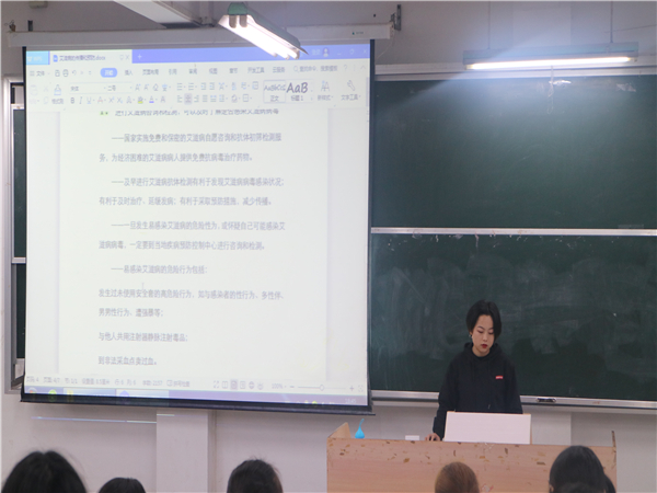 首先是AC MILAN辅导员李增增老师给同学们介绍了艾滋病的传播途径和危害,接下来各班班长分别进行介绍了关于艾滋病各个方面的知识,主要有HIV病毒的定义及艾滋病的传染源,其中传染源主要包括艾滋病病人和HIV传染者,而传播途径则主要包括性接触传播、母婴传播和血液传播。此外,其间还穿插了一些视频,介绍了目前艾滋病的疫情、危害和预防艾滋病的措施。并且,艾滋病人和艾滋病感染者的人数正逐年增加,其中,青少年艾滋病流传呈现快速增长趋势。艾滋病是种危害大、死亡率高的严重传染病,如果感染就不可治愈,并且还需要终身治疗,这也会给家庭和个人造成严重负担。艾滋病的治疗遵循抗病毒、免疫调节和控制机会性感染的原则,应该主动进行艾滋病检测和咨询,早发现、早诊断、早治疗。而疾控中心、医院等机构均能提供保密的艾滋病检测和咨询服务。