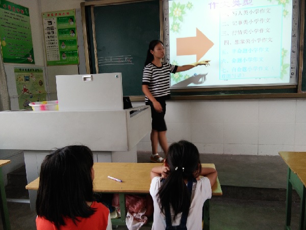 早读是英语,志愿者带领学生们读所学的英语字母,有些同学一些字母发音不准,志愿者对他们单独进行辅导。不同的课堂有不同的收获,不同的体验,不同的见闻。语文课,说的是作文,志愿者讲了写作方法与技巧,并布置作业巩固知识。英语课,26个英语字母,并教了以字母开头的简单单词,在课堂上记住,并能正确写出。科学课,志愿者讲解了八大行星,包括每一颗行星的基本特征和形状。学生们非常感兴趣。手工课,志愿者教的是百合花,由于过程有些复杂,一些低年级的孩子跟不上老师的节奏,很多学生都举手寻求老师的帮助,老师有点忙不过来。时间过得很快,一会儿就下课了,只有下午继续教孩子们。