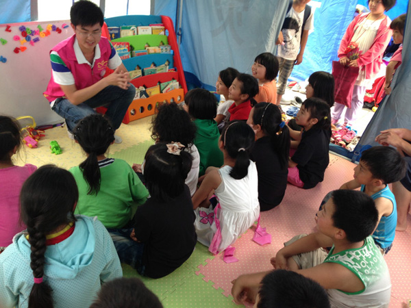 离芦山县城20几公里的飞仙关镇中心校,在汶川大地震的重创后,新校园重新屹立了,这次的芦山大地震幸免未有较大破裂。一下车,陈旭东就看见在流动书屋里学习的孩子们,顿时就被他们的坚强、爱学习感动,看着孩子闪烁的眼睛,期待着新老师到来的眼神,这个大男孩的心也被融化了。当校长亲切的叫他小陈老师时,他谦虚的说自己现在还不是老师,是一个学生;当踏进学校的板房,看到地上红砖累积成地面,桌上立着黑板,看学生们在这么艰难的环境下复课,包括幼小初的300多名学生,只有6、7个老师时,心里的触动更大;当听到60几岁的志愿者周婆婆讲述一个小男孩不玩积木的理由是“积木要倒,像我家的房子一样”后,难掩对灾区人民的心疼。