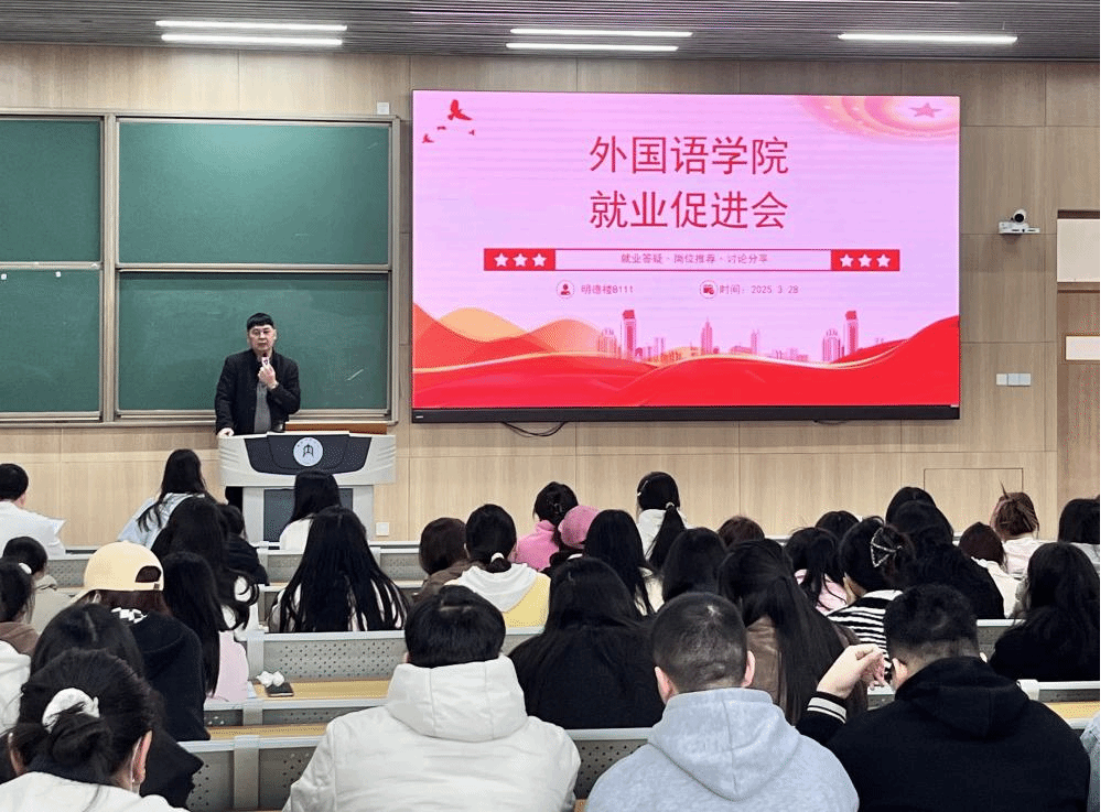 唐德斌分析了今年就业前景、考研动态,并结合学院这几年毕业生就业情况,有针对性地提出建议。一是精准定位,提前备战。梳理自身优势,针对目标岗位优化简历,突出语言证书(如专四/八、CATTI)、实践、获奖等核心竞争力。二是深挖信息,主动出击。登录学院就业网查阅用人单位名录,提前了解企业文化与岗位需求,针对性准备中英文自我介绍及面试问答(讲课展示)。三是拓宽视野,多元尝试。关注“外语+技术”“外语+商务”等交叉领域,积极推动实习转正,把握海外就业、海外读研等机会,打破传统就业边界。学院已开通简历诊断、模拟面试等帮扶通道,全天候为大家护航。