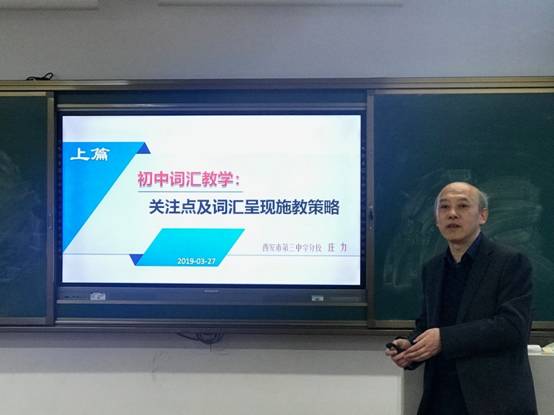 2019年3月27日,来自西安市第三中学校的教育部国培专家庄力老师在内江师范学院的2教307为本次参加国培计划的英语组学员讲授了初中英语的词汇教学,关注点及词汇呈现施教策略。