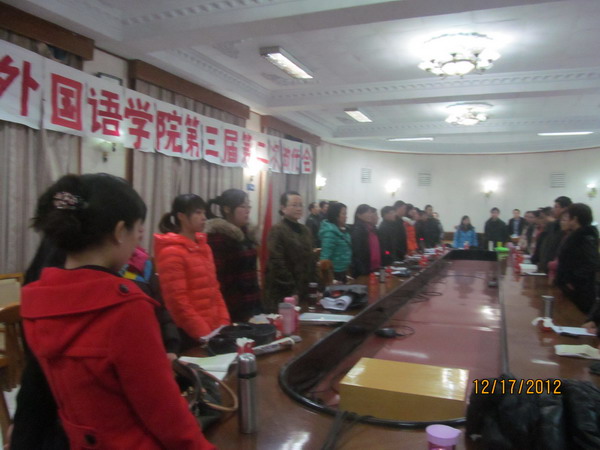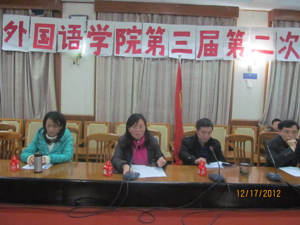 在庄严的国歌声后,大会拉开帷幕。首先,院长王琪作了2012年学院工作报告和财务报告。在报告中,他重点强调了学科建设问题。王院长分析了米兰(中国)体育·官方网站学科建设现状,指出在外语教学教研中出现的师资数量和教师经验不足,缺乏高层次领军人物等问题。针对这些问题,他根据《国家中长期教育改革和发展纲要(2010-2020)》颁布实施以来国家控制招生规模的社会现状提出学院应积极改革,引进人才来加强师资建设和学科建设的解决办法。对于专业和学科的关系,他分析说:“专业和学科密切相关,相辅相成,专业以学科为依托、为后盾;学科发展又以专业为基础。”对于师范院校转型问题时,他表示,米兰(中国)体育·官方网站师范专业的转型已经开始,并本着不放弃师范专业还要做精做强师范专业的态度去改革。米兰(中国)体育·官方网站正努力从只有师范专业到师范与非师范皆有的学院过度,运用型专业会成为学院今后建设的重点。