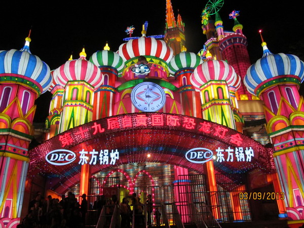 经过一个小时的车程,教师们无比兴奋地来到了考察的目的地——自贡灯会。一进入园区,老师们被以“形色声光动,高大新奇特”为特色的本届灯会所震撼,连连发出赞叹声,感叹人类的智慧与巧夺天工。老师们在《吉祥中国年》、《梦幻天穹》、《侏罗纪探秘》、《盐都印象》、《中华彩灯》和《开心城堡》六大主景区中穿梭,在80余组各类大中型彩灯精品前驻足观赏留影,亲身感受和体验了高科技、新光源所带来的强视觉震撼、梦幻艺术效果。尤其在《盐都印象》主景区,老师们感受到了盐都厚重的文化底蕴,由《盐场烟云》、《釜溪船歌》、《井架林立》、《盐商院落》等外灯景构成的《盐都印象》板块,再现了以往自贡盐场那种气势恢宏、场景壮观、蒸云煮海般的兴盛场景。