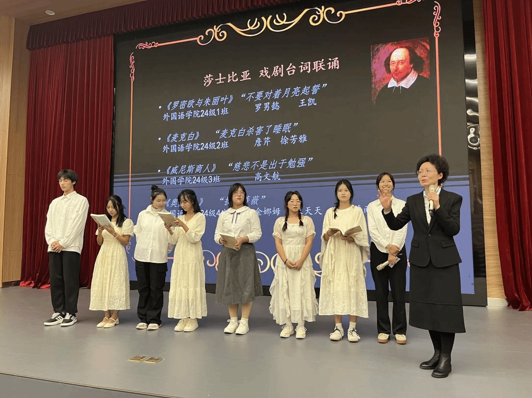 讲座伊始,王彤教授播放了“文学与生命的理解”和“莎士比亚戏剧片段”后,结合自身经历,从四个方面来展开讲座。第一,“大学何为”。她认为,大学生在大学,应当多参与培养情操的活动,如参加莎士比亚戏剧的表演,以身体力行感受文艺之美。第二,“何谓经典”。百年经典永传承,只有经过百年洗礼仍屹立在文学史上的书籍才能称之为经典。只有将阅读像莎士比亚戏剧、红楼梦等一系列文学经典著作,才能打好欣赏文学美、感受诗意生活的基础。第三,“人在何处”。王彤先是与同学们分享了经典画作:《维纳斯的诞生》,与同学们分享了此画作者想表达的美感与背景故事。而后又生动分享了自己在国外访学中的见闻,让学生仿若身临其境,对艺术与文学的审美概念有了更深入的理解。第四,“优雅何来”。王彤从文化与品位、形象与气质、生存与生活三个方面讲述了关于“优雅的气质”该如何培养。随后,新生各班先后有18名同学热情饱满地参与了莎士比亚戏剧台词联诵,深深感受到了经典穿越时光的博雅厚重。最后,她让同学们齐读莎士比亚十四行诗第十八首,并以其最后一句话:“这诗将长存,并且赐给你生命!”为结束语,留给同学们意犹未尽的思考。