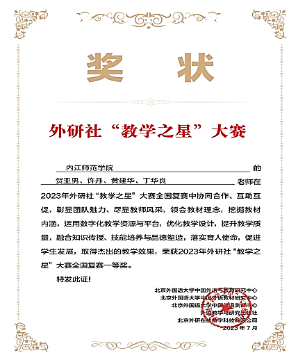 近日,2023年外研社“教学之星”大赛结果公布,米兰(中国)体育·官方网站组建的“高级英语”教学团队(贺亚男、许丹、黄建华、丁华良)荣获英语类专业组四川省赛区决赛三等奖及全国复赛一等奖。