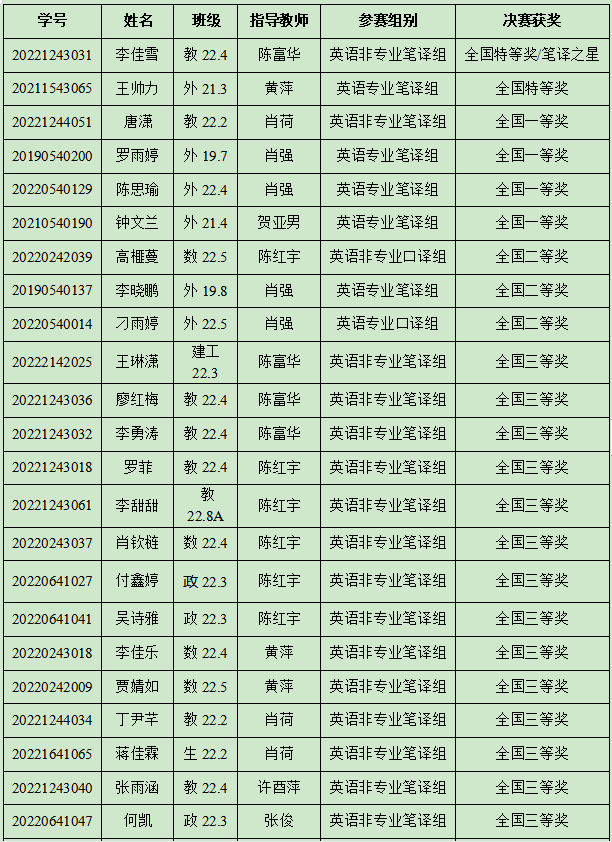 第八届中西部翻译大赛我校学子获奖情况一览表