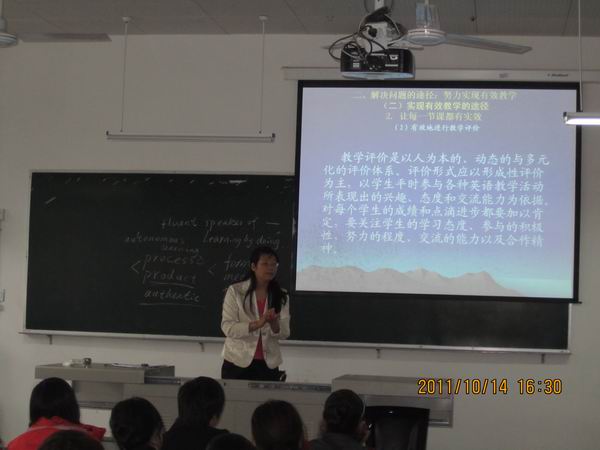 首先,段老师提出了课堂教学中存在的无效或低效教学等问题,然后对实现有效教学的途径进行了阐述。段老师的讲座理论联系实际,有关有效教学的方法和技巧的举例使学员深受启发。