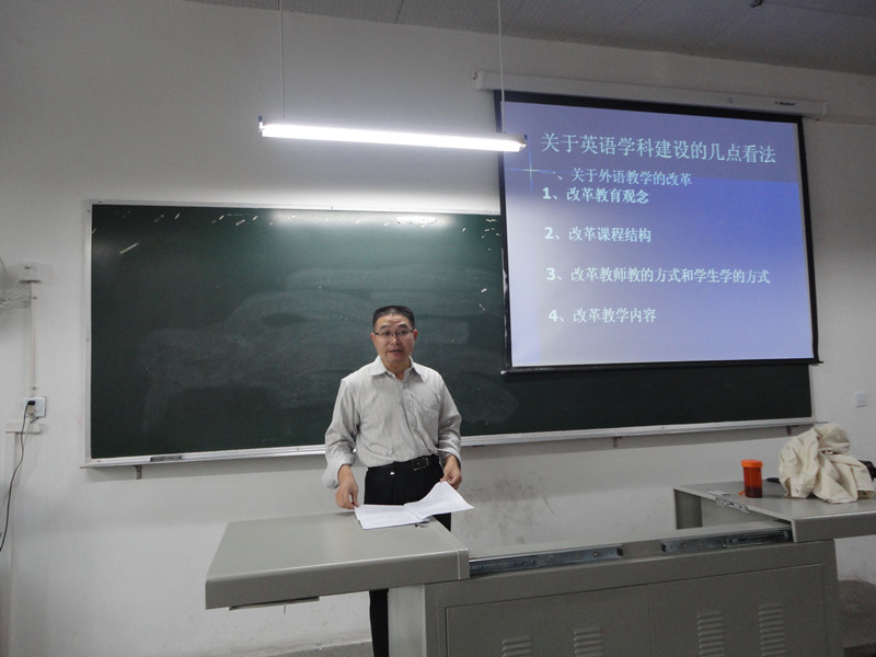 首先,唐长贵老师以一段视频拉开了讲座的帷幕,随后就外语教育教学改革作了深入的阐述,他指出外语教学要改革教育观念、课程结构、教师教的方式和学生学的方式及教学内容,进而使外语教学有所突破,并以2011年英语高考阅读为范本进行了教学演示。然后,唐老师对课程目标、课程实施、英语教育环境建设、教师培训、教研组文化建设等方面提出了看法和建议。在教研组文化建设中,唐老师提出了切实可行的策略和途径,具有很强的针对性和指导性。