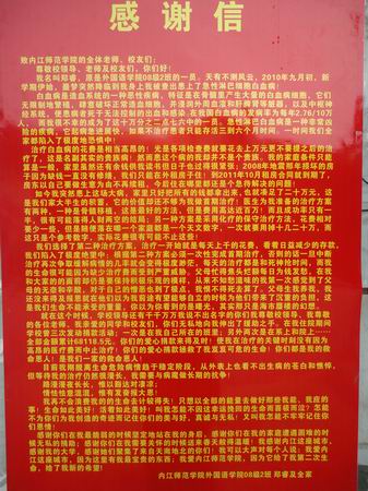 郑睿是来自5.12大地震极重灾区的一名普通女孩,地震带来的创伤刚刚平复,可命运晴天霹雳般地再次冷飕飕地向她发出无情的抽打,2010年9月不幸患上了急性白血病,高昂的医药费对于她们一家来说简直是天文数字,面对突然的灾难,全校师生积极行动,为郑睿同学献爱心,募集善款近7万元,使得她的病情得到了及时有效的控制。郑睿在感谢信中说:“感谢你们在我最脆弱的时候坚定地站在我的身后,感谢你们在我的家庭遭遇困难的时候无私的捐助;感谢你们在我最需要关怀的时候送来春天般的温暖!我感谢我的大学,我爱内江师范学院,因为它给了我第二次生命,给了我新的希望!”