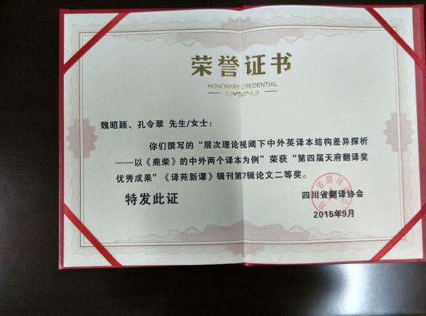 米兰(中国)体育·官方网站青年教师魏昭颖撰写的论文“层次理论视阈下中外英译本结构差异探析——以《鹿寨》”在“四川省第四届天府翻译奖优秀成果”评选中被评为二等奖,为此,向魏昭颖老师表示祝贺!