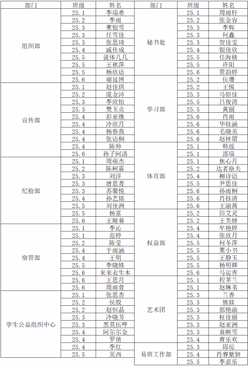 为加强学生干部队伍建设,不断提升服务水平。AC MILAN团委学生会本着公开、平等、 公正、竞争、择优的原则,经过实习期各部门考察和综合测评,现将米兰(中国)体育·官方网站第一届二任团委学生会志愿者最终名单公示如下: