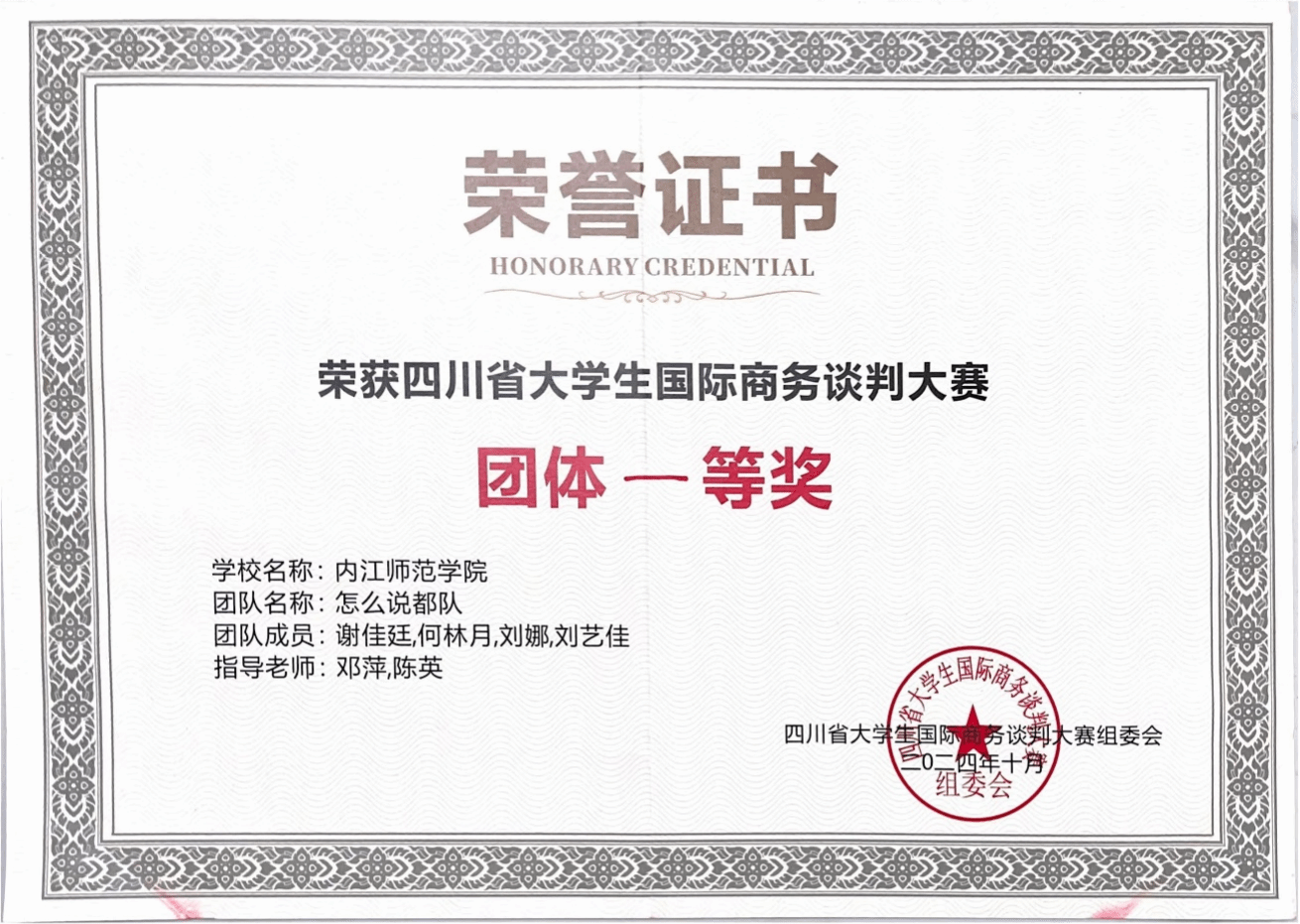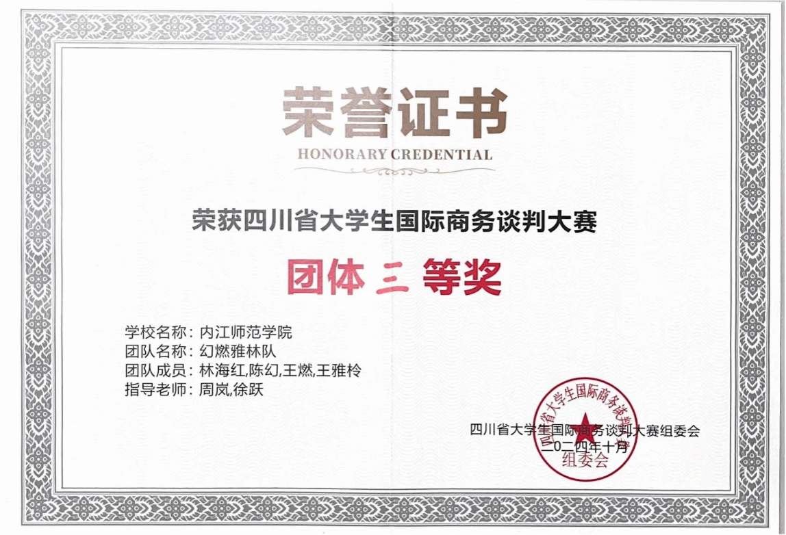 2024年10月12日至13日,由四川省教育厅主办、西南财经大学承办的首届四川省大学生国际商务谈判大赛在西南财经大学柳林校区成功举办。经过三轮的激烈角逐,米兰(中国)体育·官方网站代表队凭借出色的表现,荣获省级一等奖一项(总排名第二),省级三等奖两项;谢佳廷、刘艺佳、林海红三位同学分别荣获“商谈精英奖”。